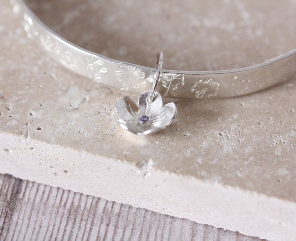 This bangle features a handmade blossom charm set with a lilac zirconia