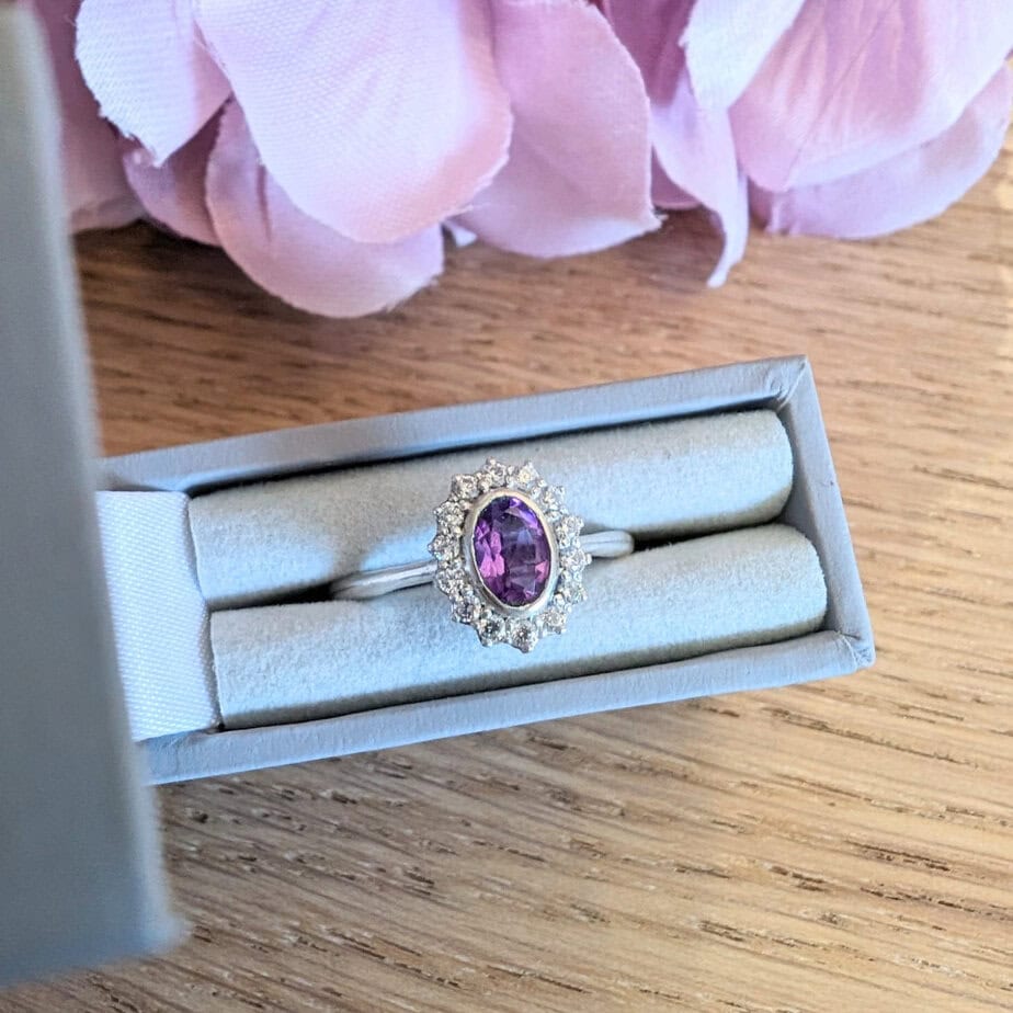 Gorgeous oval cluster ring set with a zirconia halo, the centre stone is 6×4 and you can choose from a selection of gemstones.