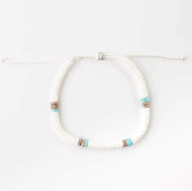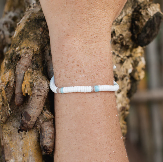 Inspired by the crisp white beach of Tanjung Aan, this puka shell bracelet is patterned with coloured beads to resemble the bright blue waters and surrounding forest landscape.